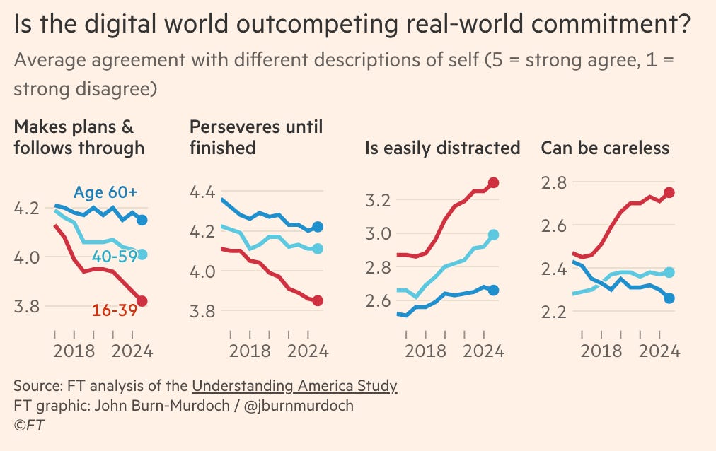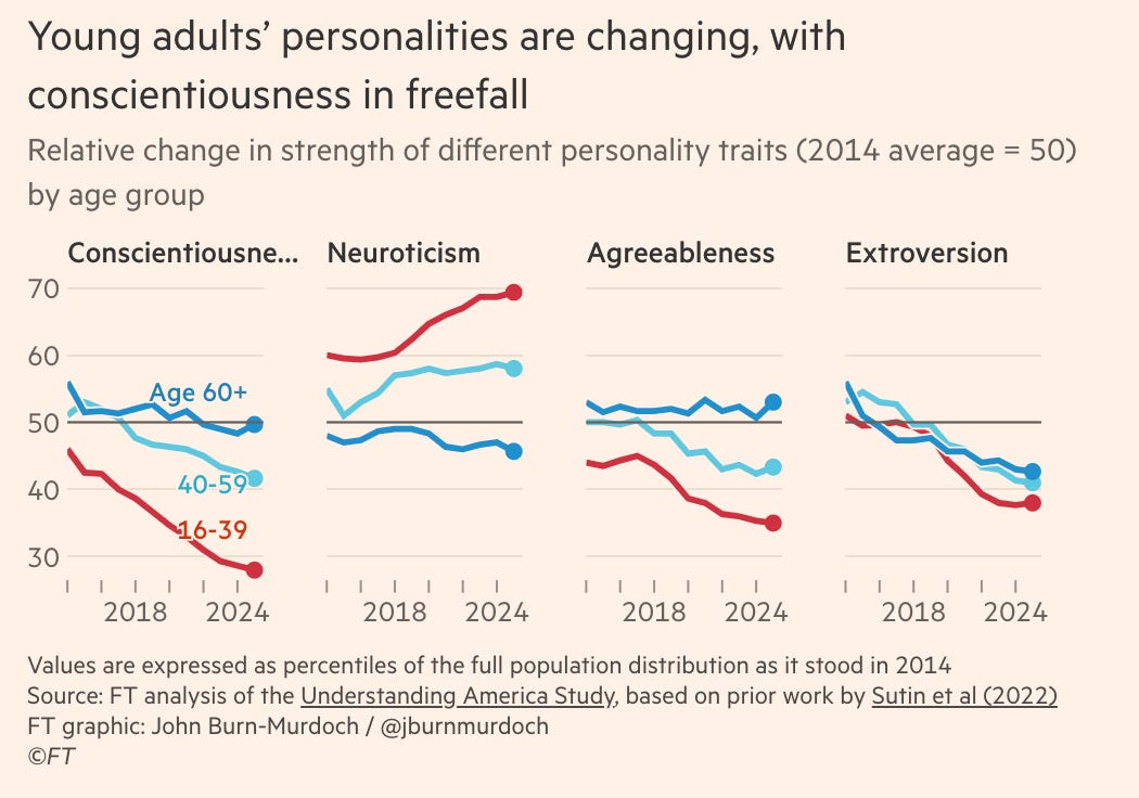 The great data journalist John Burn-Murdoch at the Financial Times is out with another excellent if disturbing column about a steep decline in conscientiousness and other personality changes in young people.