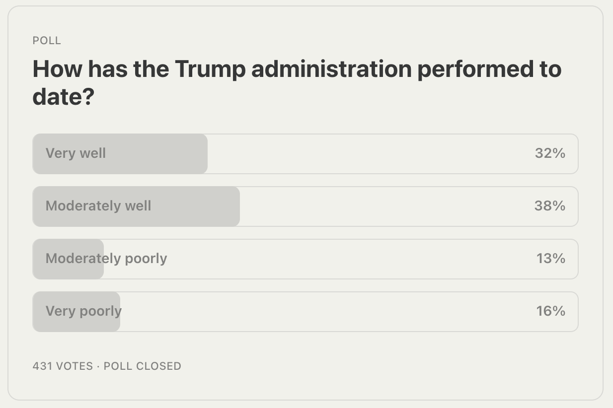 Last week’s poll was interesting. A bit over two-thirds of you think Trump is doing a good job, and a third of you think he’s doing a poor job.