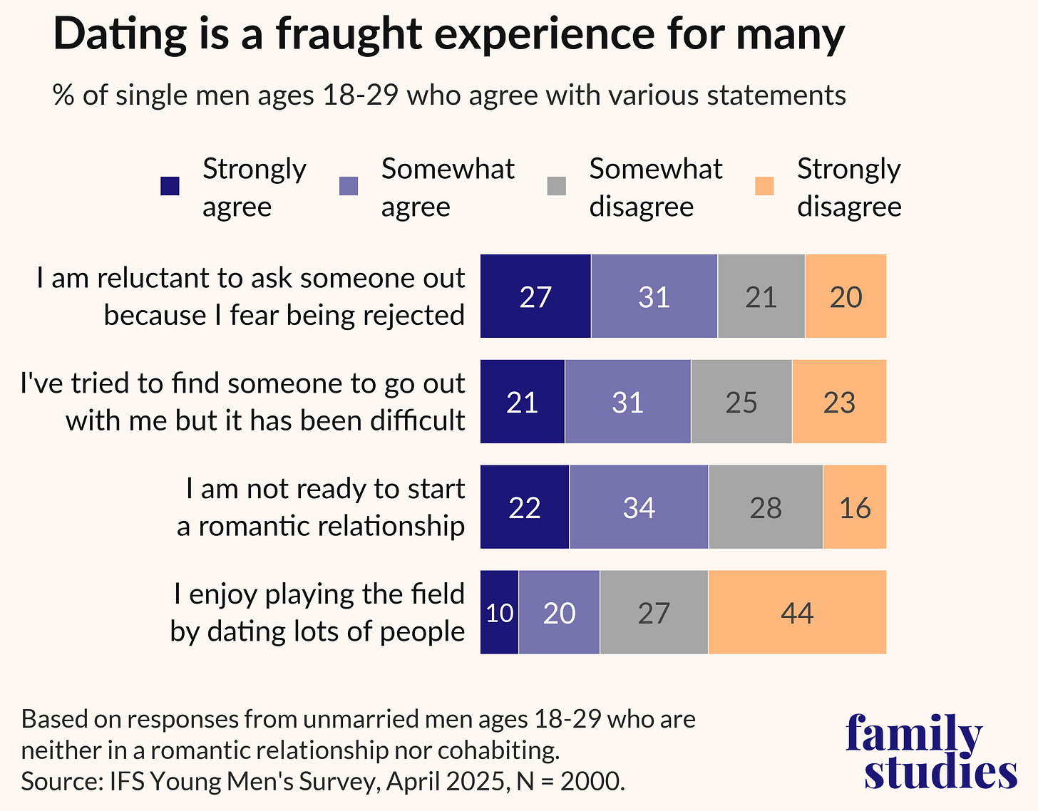 The survey has questions about dating and marriage. We see here that the majority of young men are afraid to ask women out.
