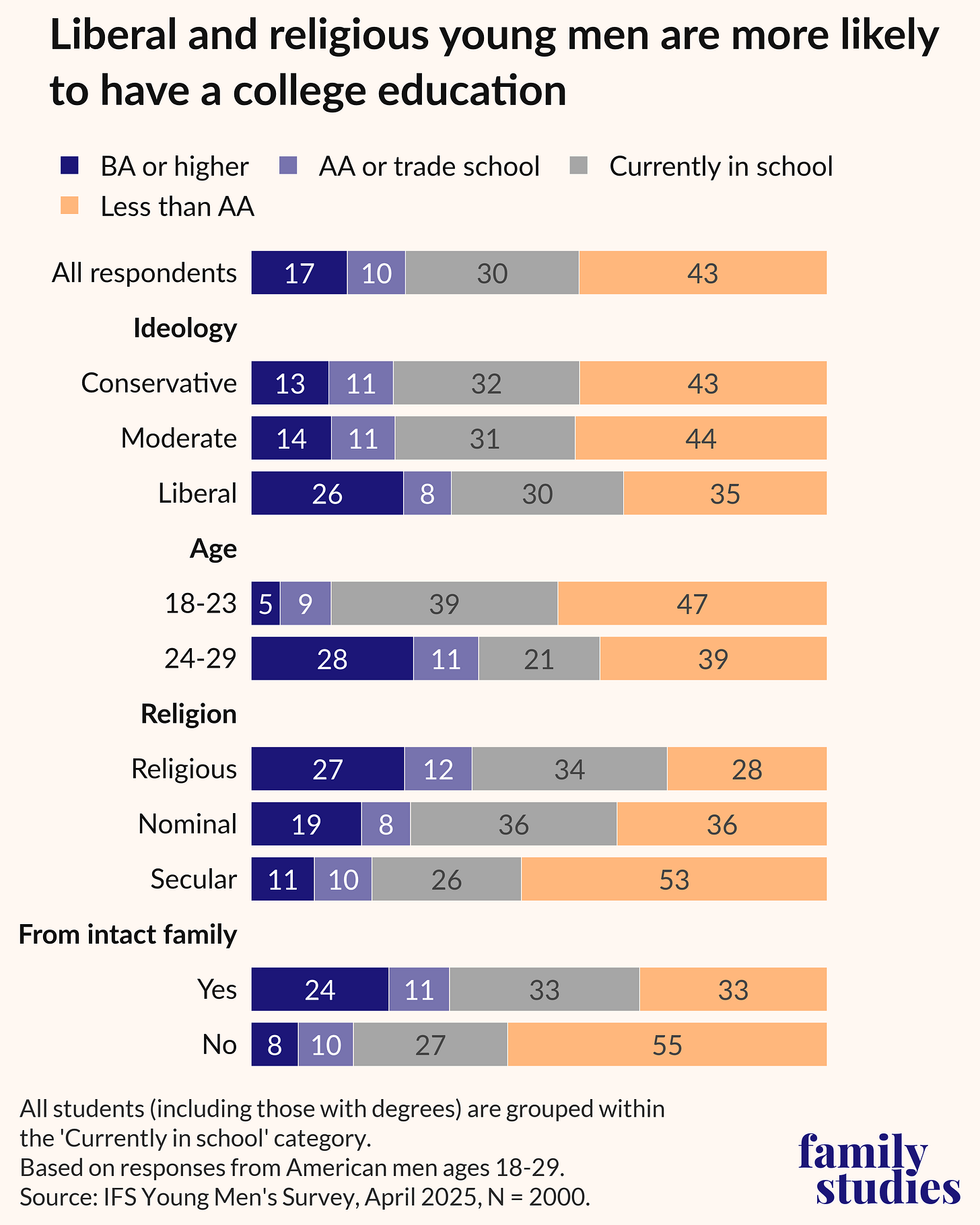 There’s also an interesting look at education by various demographic characteristics. Keep in mind, many of the men surveyed are pretty young, and can’t be expected to have completed college yet.