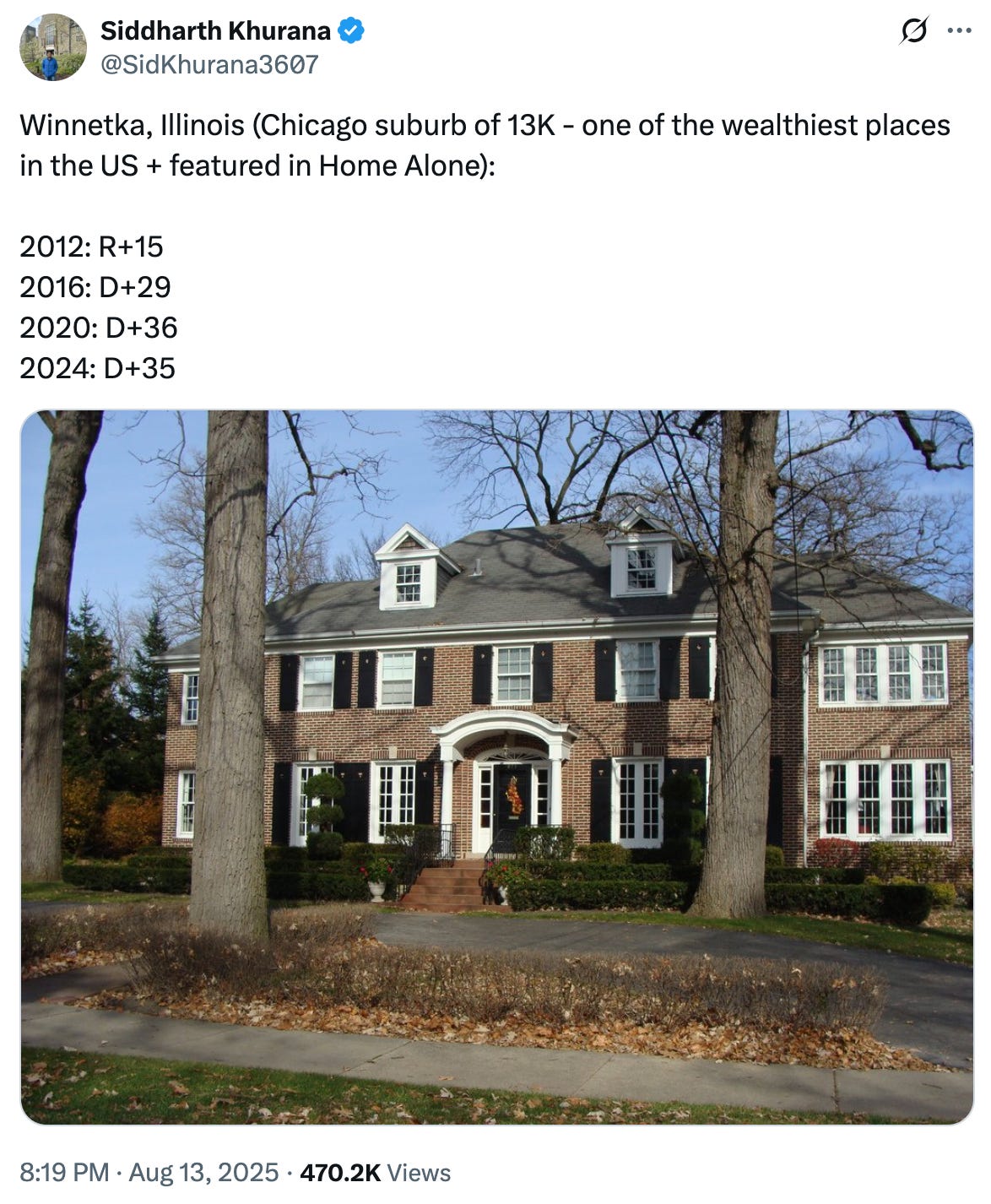 X user Siddharth Khurana posts interesting maps of where different ethnic groups reside, as well as electoral shifts in different communities. His post from yesterday about a major shift to the left in Winnetka, Illinois, one of Chicago’ most prestigious suburbs, made waves.