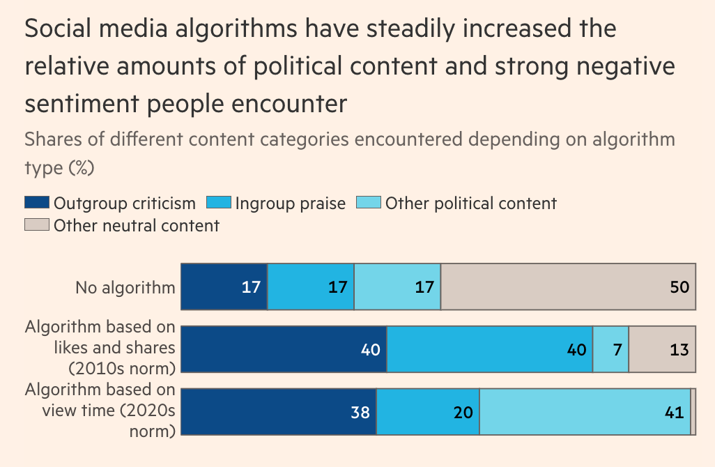 The results were striking. Relative to the counterfactual of simply showing people an even mix of all content, the recommendation algorithm based on likes and shares (essentially how social media worked during the 2010s) consistently boosted posts that praised the viewer’s in-group and blamed their out-group, as well as pushing much more political messages into people’s feeds.