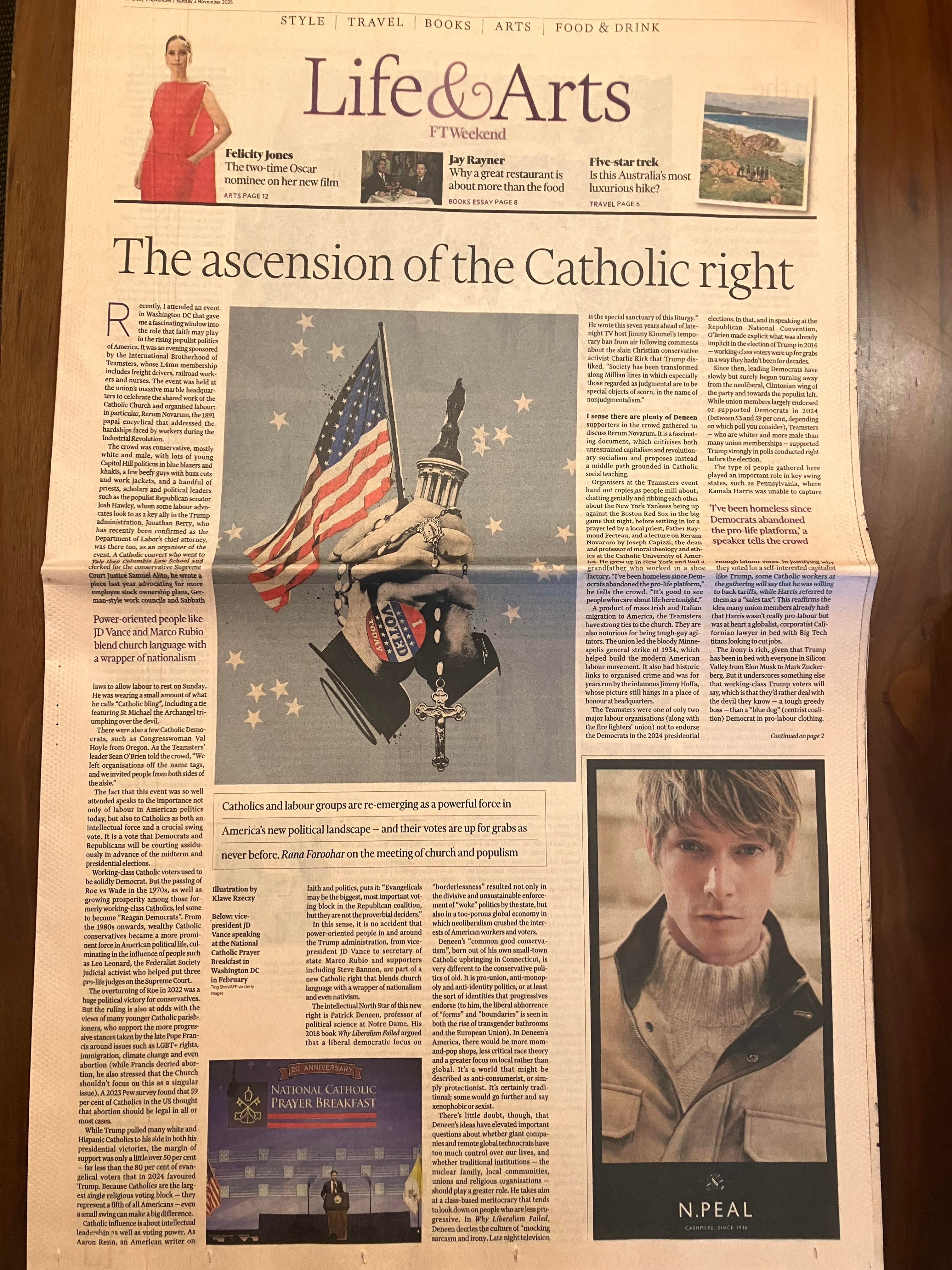 As you know, the Financial Times is my favorite newspaper, so it’s always a delight when I’m quoted in it, as I was last weekend in a great essay by Rana Foroohar on the rise of the Catholic right in America.