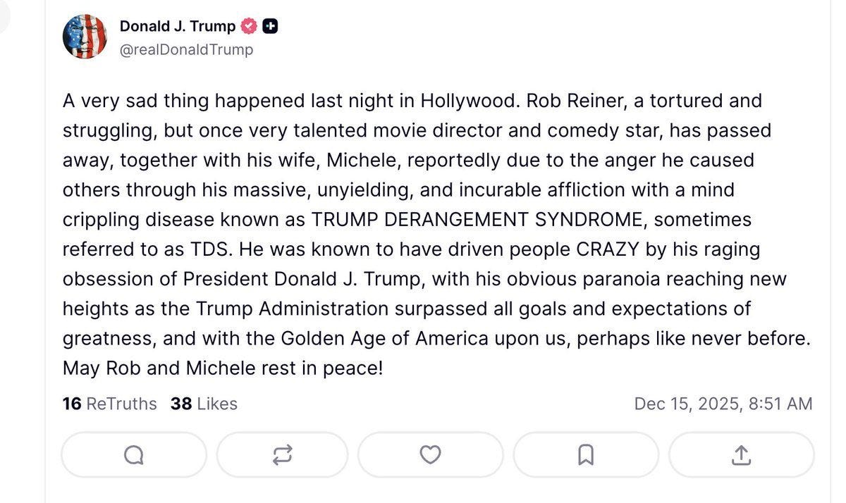 Shortly after Rob Reiner and his wife were murdered by their disturbed son in a domestic tragedy, President Trump posted this: